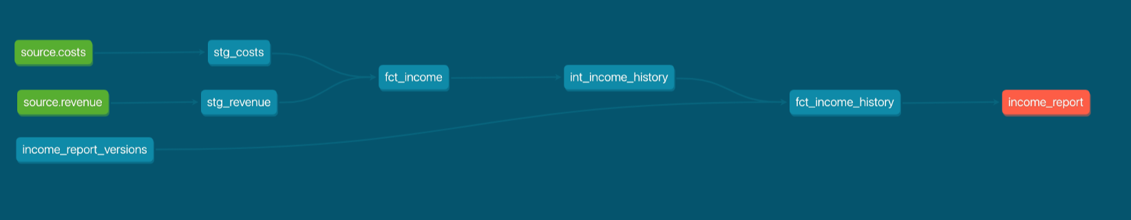 The original fct_income model now calculates the income for each version of source data, every time Joanne executes a dbt run. In other words, the downstream fct_ models are version-aware. Because of this, Joanne changes the name of fct_income to fct_income_history to be more descriptive.